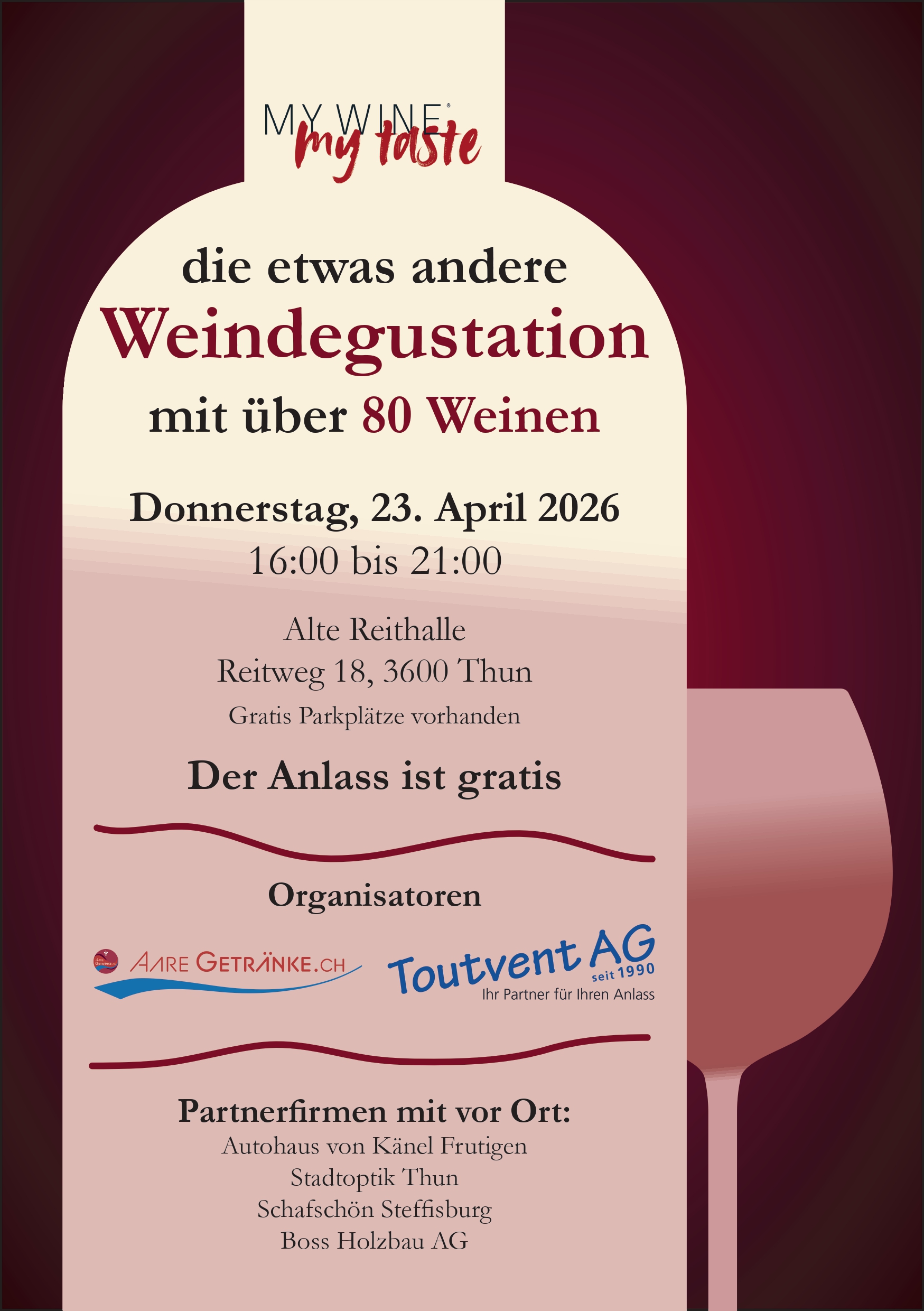 Wir freuen uns, gemeinsam mit unserer Partnerfirma Toutvent AG auf der Alten Reithalle Thun eine Weindegustation der anderen Art durchzuführen: Sie wählen aus über 80 Weinen aus aller Welt diejenigen aus, die Sie ansprechen. Wie Sie Ihren Rundgang gestalten, ist Ihnen überlassen – wir stehen Ihnen für Ihre Fragen und Anliegen zur Verfügung. Ganz nach dem Motto «My wine – my taste».
